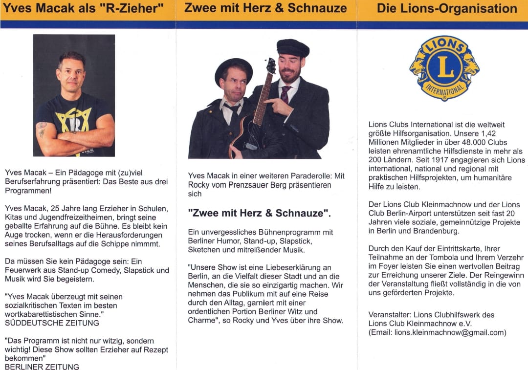 Am 27.02.2026 erleben Sie diesmal Yves Macak in seiner Paraderolle als "R-Zieher". Ein urkomisches Feuerwerk aus Stand-Up-Comedy, Slapstick und Musik. In einer weiteren Rolle tritt er zusammen mit "Rocky vom Prenzsauer Berg" auf. Als "Zwee mit Herz und Schnauze" liefern die beiden eine Liebeserklärung an Berlin, mit ganz viel Berliner Humor, Sketchen und Musik. Es wird ein unvergesslicher Abend. Versprochen!