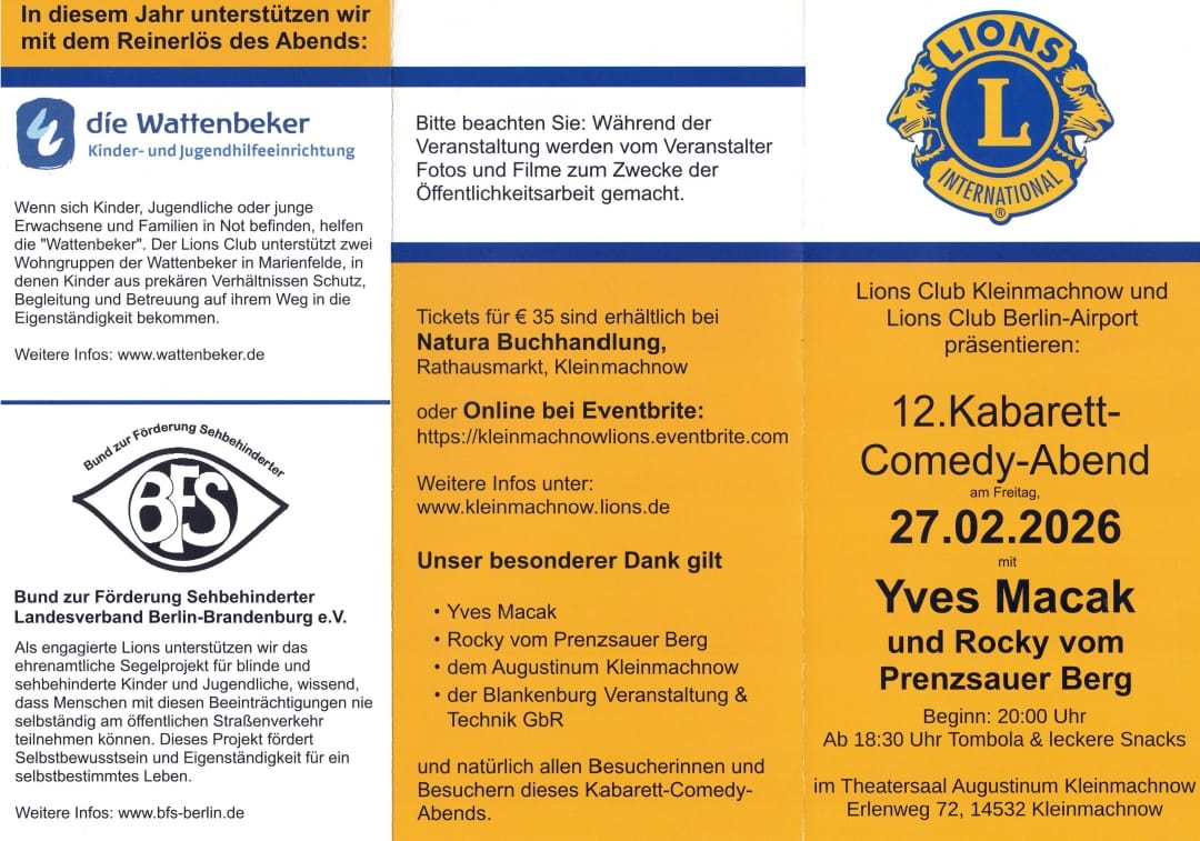 Zum 12. Mal laden die Lions Clubs Kleinmachnow und Berlin-Airport zum Angriff auf die Lachmuskeln für den guten Zweck ein.
